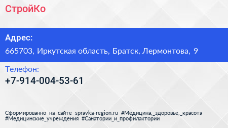 СтройКо по адресу 665703, Иркутская область, Братск, Лермонтова, 9 в дальнейшем Организация, размещена в следующих категориях: