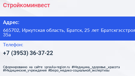Стройкоминвест по адресу 665702, Иркутская область, Братск, 25 лет Братскгэсстроя, 35а в дальнейшем Организация, размещена в следующих категориях: