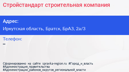Стройстандарт, строительная компания по адресу Иркутская область, Братск, БрАЗ, 2а/3 в дальнейшем Организация, размещена в следующих категориях: