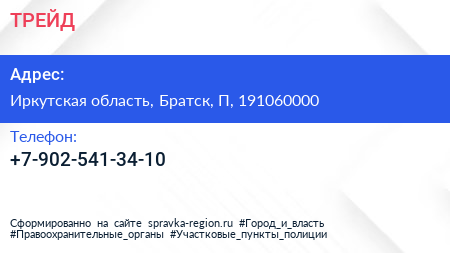 ТРЕЙД по адресу Иркутская область, Братск, П, 191060000 в дальнейшем Организация, размещена в следующих категориях: