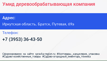Умид, деревообрабатывающая компания по адресу Иркутская область, Братск, Путевая, 69а в дальнейшем Организация, размещена в следующих категориях: