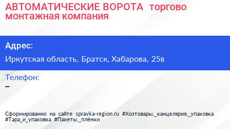 АВТОМАТИЧЕСКИЕ ВОРОТА+, торгово-монтажная компания по адресу Иркутская область, Братск, Хабарова, 25в в дальнейшем Организация, размещена в следующих категориях: