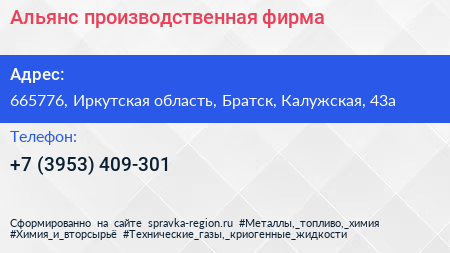 Альянс, производственная фирма по адресу 665776, Иркутская область, Братск, Калужская, 43а в дальнейшем Организация, размещена в следующих категориях: