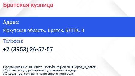 Братская кузница по адресу Иркутская область, Братск, БЛПК, 8 в дальнейшем Организация, размещена в следующих категориях: