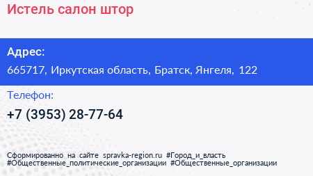 Истель, салон штор по адресу 665717, Иркутская область, Братск, Янгеля, 122 в дальнейшем Организация, размещена в следующих категориях: