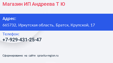 Магазин, ИП Андреева Т.Ю. по адресу 665732, Иркутская область, Братск, Крупской, 17 в дальнейшем Организация, размещена в следующих категориях: