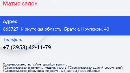 Матис, салон по адресу 665727, Иркутская область, Братск, Крупской, 43 в дальнейшем Организация, размещена в следующих категориях: