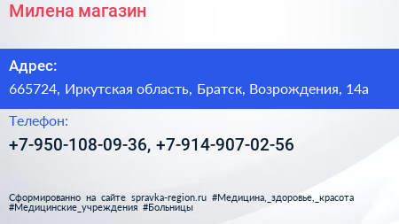 Милена, магазин по адресу 665724, Иркутская область, Братск, Возрождения, 14а в дальнейшем Организация, размещена в следующих категориях: