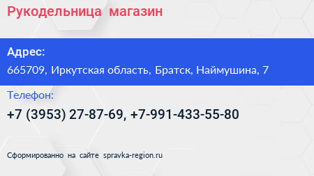 Рукодельница+, магазин по адресу 665709, Иркутская область, Братск, Наймушина, 7 в дальнейшем Организация, размещена в следующих категориях: