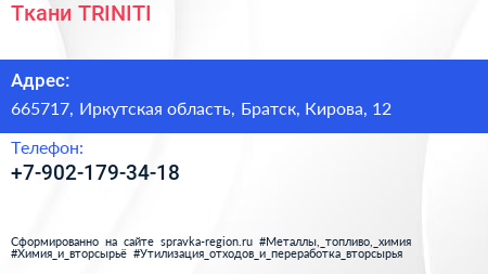 Ткани TRINITI по адресу 665717, Иркутская область, Братск, Кирова, 12 в дальнейшем Организация, размещена в следующих категориях: