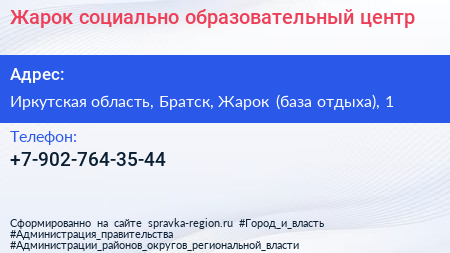 Жарок, социально-образовательный центр по адресу Иркутская область, Братск, Жарок (база отдыха), 1 в дальнейшем Организация, размещена в следующих категориях: