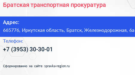 Братская транспортная прокуратура по адресу 665776, Иркутская область, Братск, Железнодорожная, 6а в дальнейшем Организация, размещена в следующих категориях: