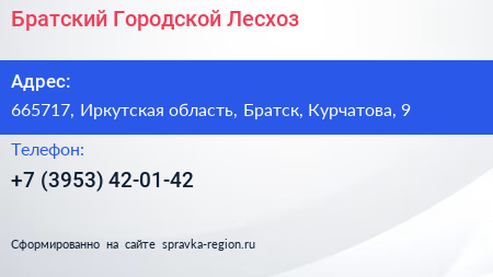 Братский Городской Лесхоз по адресу 665717, Иркутская область, Братск, Курчатова, 9 в дальнейшем Организация, размещена в следующих категориях: