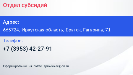Отдел субсидий по адресу 665724, Иркутская область, Братск, Гагарина, 71 в дальнейшем Организация, размещена в следующих категориях:
