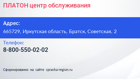 ПЛАТОН, центр обслуживания по адресу 665729, Иркутская область, Братск, Советская, 2 в дальнейшем Организация, размещена в следующих категориях: