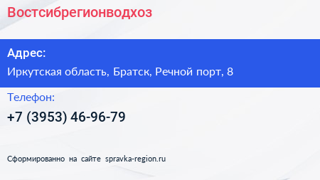 Востсибрегионводхоз по адресу Иркутская область, Братск, Речной порт, 8 в дальнейшем Организация, размещена в следующих категориях: