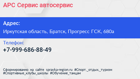 АРС-Сервис, автосервис по адресу Иркутская область, Братск, Прогресс ГСК, 680а в дальнейшем Организация, размещена в следующих категориях: