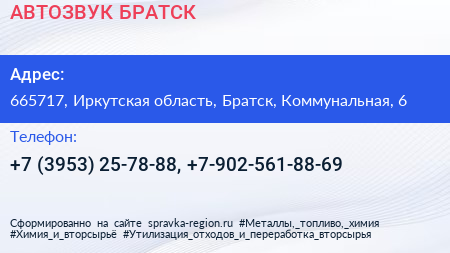 АВТОЗВУК БРАТСК по адресу 665717, Иркутская область, Братск, Коммунальная, 6 в дальнейшем Организация, размещена в следующих категориях: