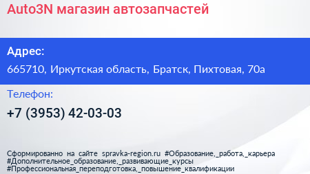Auto3N, магазин автозапчастей по адресу 665710, Иркутская область, Братск, Пихтовая, 70а в дальнейшем Организация, размещена в следующих категориях: