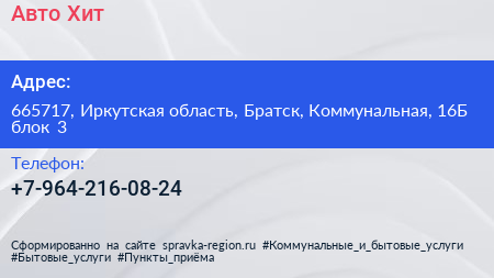 Авто-Хит по адресу 665717, Иркутская область, Братск, Коммунальная, 16Б блок 3 в дальнейшем Организация, размещена в следующих категориях: