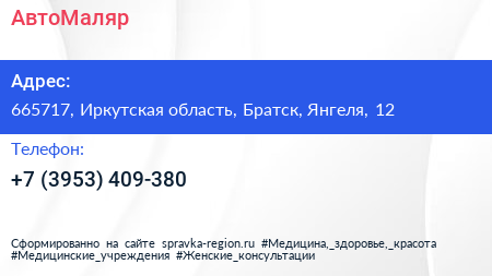 АвтоМаляр по адресу 665717, Иркутская область, Братск, Янгеля, 12 в дальнейшем Организация, размещена в следующих категориях: