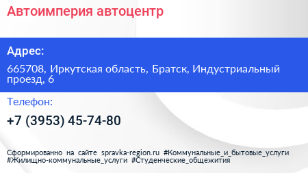 Автоимперия, автоцентр по адресу 665708, Иркутская область, Братск, Индустриальный проезд, 6 в дальнейшем Организация, размещена в следующих категориях: