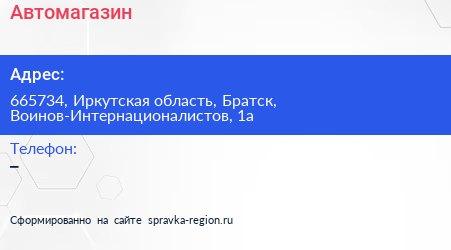 Автомагазин по адресу 665734, Иркутская область, Братск, Воинов-Интернационалистов, 1а в дальнейшем Организация, размещена в следующих категориях: