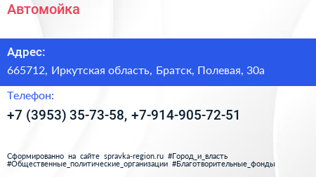 Автомойка по адресу 665712, Иркутская область, Братск, Полевая, 30а в дальнейшем Организация, размещена в следующих категориях: