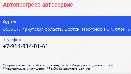 Автопрогресс, автосервис по адресу 665717, Иркутская область, Братск, Прогресс ГСК, блок 6 в дальнейшем Организация, размещена в следующих категориях: