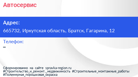 Автосервис по адресу 665732, Иркутская область, Братск, Гагарина, 12 в дальнейшем Организация, размещена в следующих категориях: