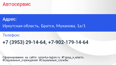 Автосервис по адресу Иркутская область, Братск, Муханова, 1а/1 в дальнейшем Организация, размещена в следующих категориях: