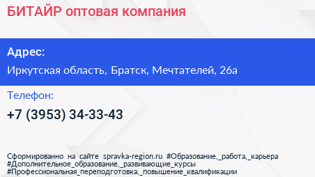 БИТАЙР, оптовая компания по адресу Иркутская область, Братск, Мечтателей, 26а в дальнейшем Организация, размещена в следующих категориях: