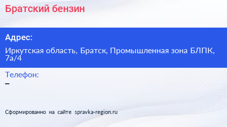 Братский бензин по адресу Иркутская область, Братск, Промышленная зона БЛПК, 7а/4 в дальнейшем Организация, размещена в следующих категориях: