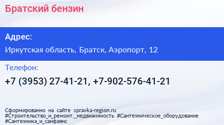 Братский бензин по адресу Иркутская область, Братск, Аэропорт, 12 в дальнейшем Организация, размещена в следующих категориях: