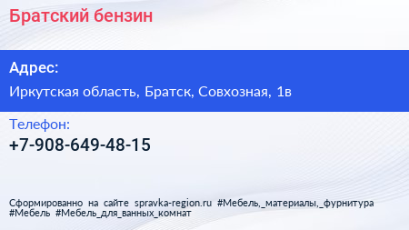 Братский бензин по адресу Иркутская область, Братск, Совхозная, 1в в дальнейшем Организация, размещена в следующих категориях: