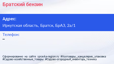 Братский бензин по адресу Иркутская область, Братск, БрАЗ, 2а/1 в дальнейшем Организация, размещена в следующих категориях: