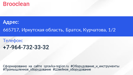 Brooclean по адресу 665717, Иркутская область, Братск, Курчатова, 1/2 в дальнейшем Организация, размещена в следующих категориях: