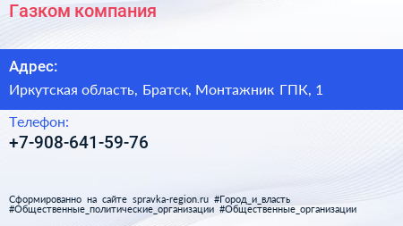 Газком, компания по адресу Иркутская область, Братск, Монтажник ГПК, 1 в дальнейшем Организация, размещена в следующих категориях: