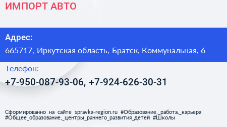 ИМПОРТ АВТО по адресу 665717, Иркутская область, Братск, Коммунальная, 6 в дальнейшем Организация, размещена в следующих категориях: