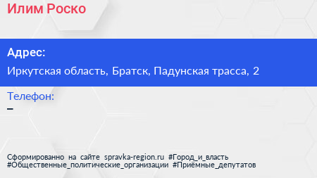 Илим-Роско по адресу Иркутская область, Братск, Падунская трасса, 2 в дальнейшем Организация, размещена в следующих категориях: