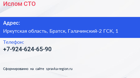 Ислом, СТО по адресу Иркутская область, Братск, Галачинский-2 ГСК, 1 в дальнейшем Организация, размещена в следующих категориях:
