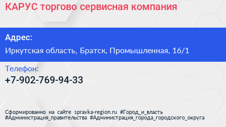 КАРУС, торгово-сервисная компания по адресу Иркутская область, Братск, Промышленная, 16/1 в дальнейшем Организация, размещена в следующих категориях: