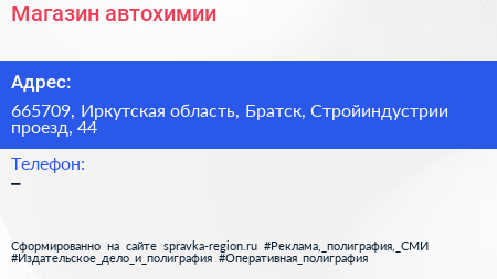 Магазин автохимии по адресу 665709, Иркутская область, Братск, Стройиндустрии проезд, 44 в дальнейшем Организация, размещена в следующих категориях: