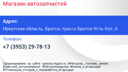 Магазин автозапчастей по адресу Иркутская область, Братск, трасса Братск-Усть-Кут, 6 в дальнейшем Организация, размещена в следующих категориях: