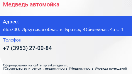 Медведь, автомойка по адресу 665730, Иркутская область, Братск, Юбилейная, 4а ст1 в дальнейшем Организация, размещена в следующих категориях: