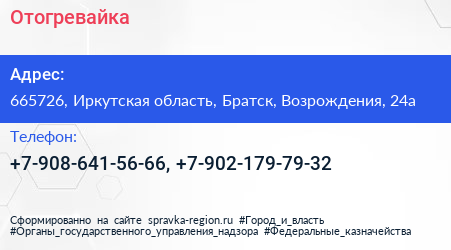 Отогревайка по адресу 665726, Иркутская область, Братск, Возрождения, 24а в дальнейшем Организация, размещена в следующих категориях: