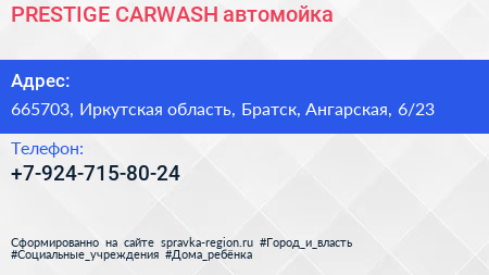 PRESTIGE CARWASH, автомойка по адресу 665703, Иркутская область, Братск, Ангарская, 6/23 в дальнейшем Организация, размещена в следующих категориях: