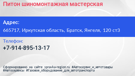 Питон, шиномонтажная мастерская по адресу 665717, Иркутская область, Братск, Янгеля, 120 ст3 в дальнейшем Организация, размещена в следующих категориях: