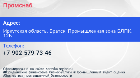 Промснаб по адресу Иркутская область, Братск, Промышленная зона БЛПК, 12Б в дальнейшем Организация, размещена в следующих категориях: