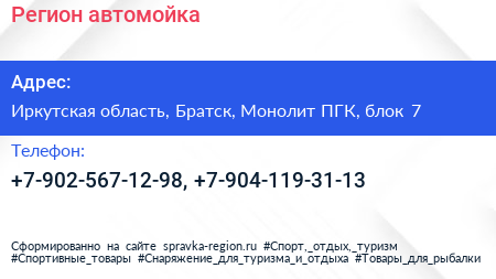 Регион, автомойка по адресу Иркутская область, Братск, Монолит ПГК, блок 7 в дальнейшем Организация, размещена в следующих категориях: